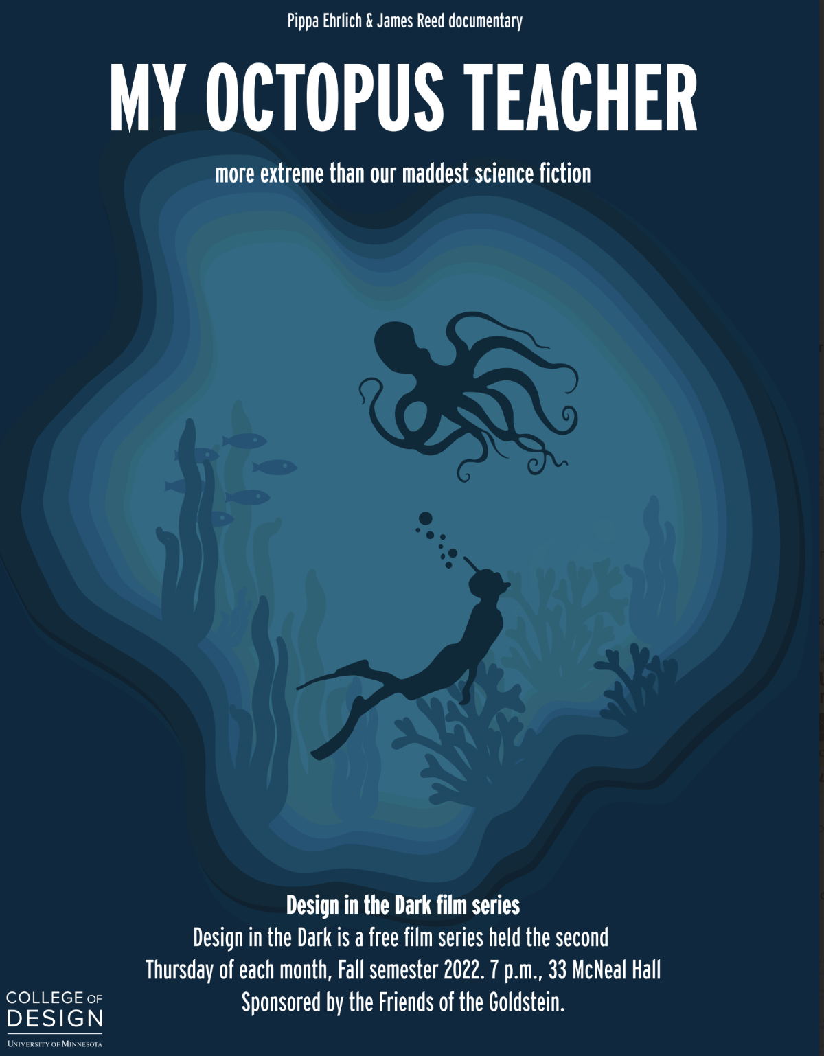 This poster was designed and created using Adobe Illustrator, for the University of Minnesota’s College of Design film series, Design in the Dark. The event featured a selection of movies, and I chose to work with the film; My Octopus Teacher, which dived into the unique friendship between an octopus and filmmaker. My objective through sketches and mood boards, was to create an engaging visual poster that promotes and conveys the film's story. This highlights my skills as a captivating designer for a given event.